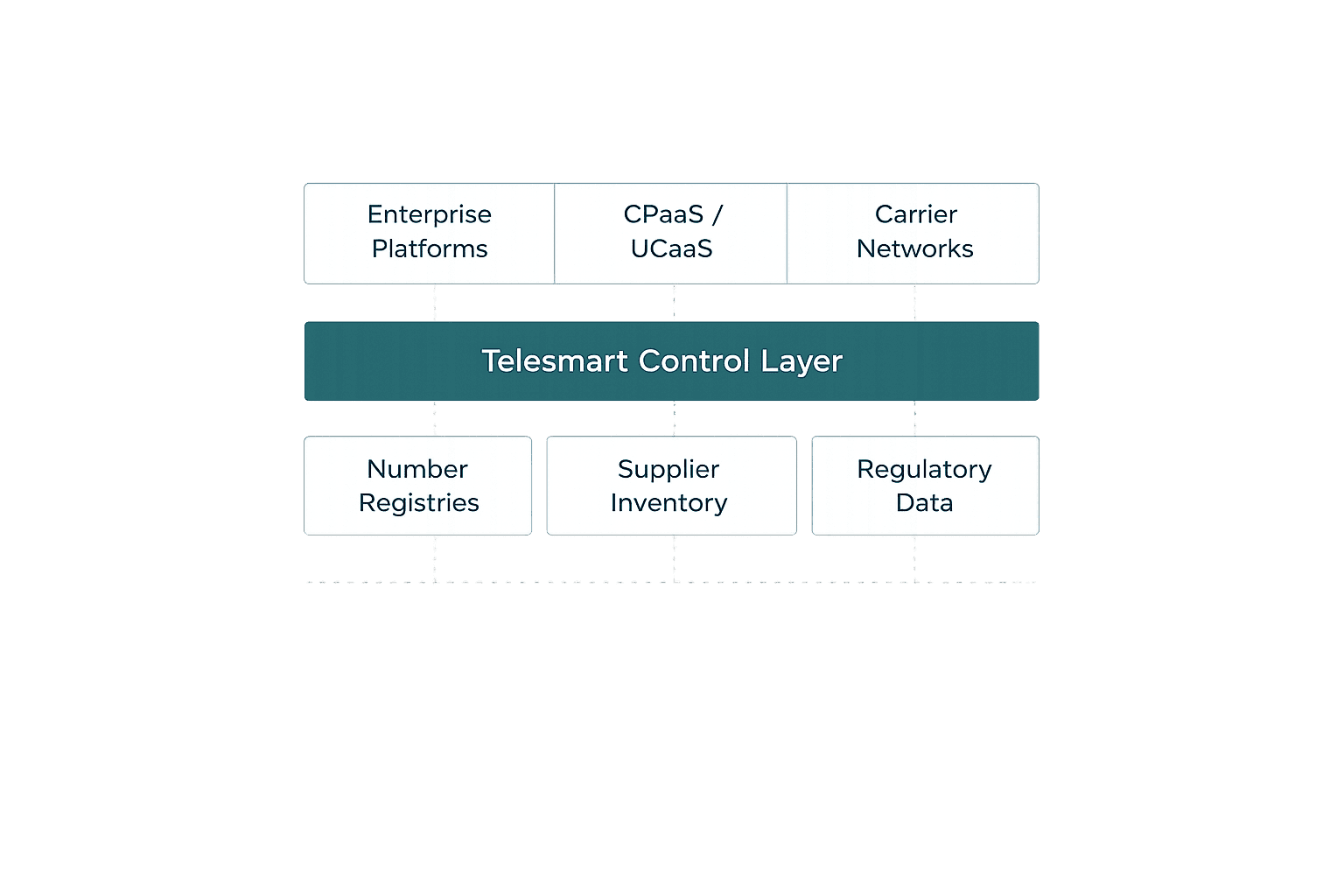 The control layer governs identifier lifecycle and service validity before these systems execute communications workflows.